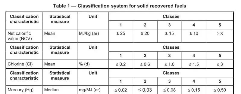 歐洲標準BS EN 15359-2011,它對SRF燃料進行5個等級的質量分類。里面的SRF燃料指的是solid recovered fuels,也就是沒有毒性的固體回收燃料,包括城市固體廢物、一般工業(yè)固廢、污水污泥等,包含的組分有木材、紙張、織物、塑料、橡膠等等。