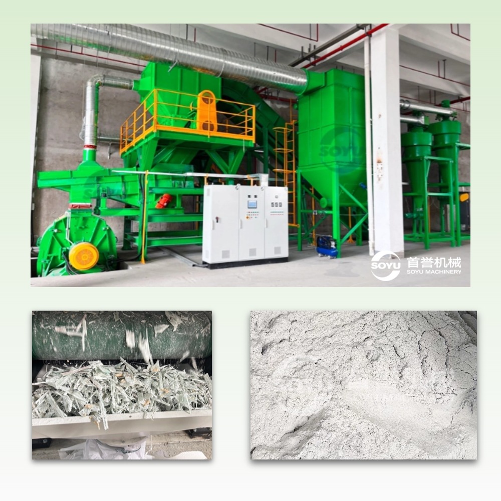 三、技術突破:智能化與精細化并行 1. 設備升級 -首譽機械研發(fā)的退役風電葉片玻璃鋼制品資源化處置系統(tǒng)等新型裝備,通過增加破碎維度,將出料粒度控制在 200目 以內(nèi),滿足高端復合材料再生需求。